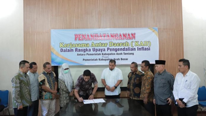 Penjabat (Pj) Bupati Aceh Besar Muhammad Iswanto melakukan penandatanganan Kerja sama Antar Daerah (KAD) dengan Pemerintah Kabupaten (Pemkab) Aceh Tamiang dalam upaya pengendalian Inflasi daerah. Penandatanganan KAD tersebut berlangsung di Kantor Bupati Aceh Tamiang, Kuala Simpang, Minggu (25/2/2024).