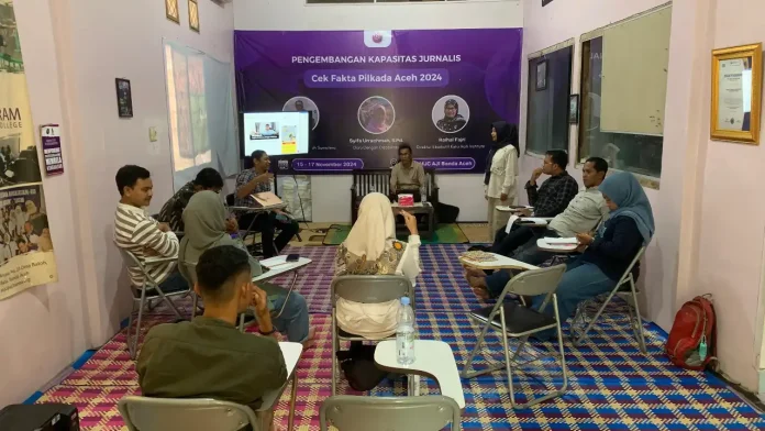 Pelatihan bertema Cek Fakta Pilkada Aceh 2024 itu menghadirkan tiga narasumber Juli Amin (Korwil Sumatera AJI Indonesia), Syifa Urrachmah, (Guru dengan disabilitas), dan Raihal Fajri (Direktur Katahati Institute).