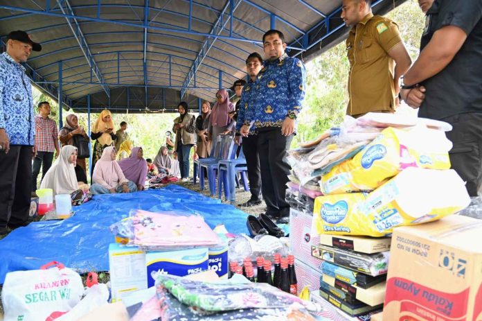 Penjabat (Pj) Bupati Aceh Besar Muhammad Iswanto bersama istri menyerahkan bantuan masa panik kepada warga korban kebakaran rumah, Senin (19/02/2024) di Paya Ue, Kecamatan Blang Bintang, Aceh Besar.