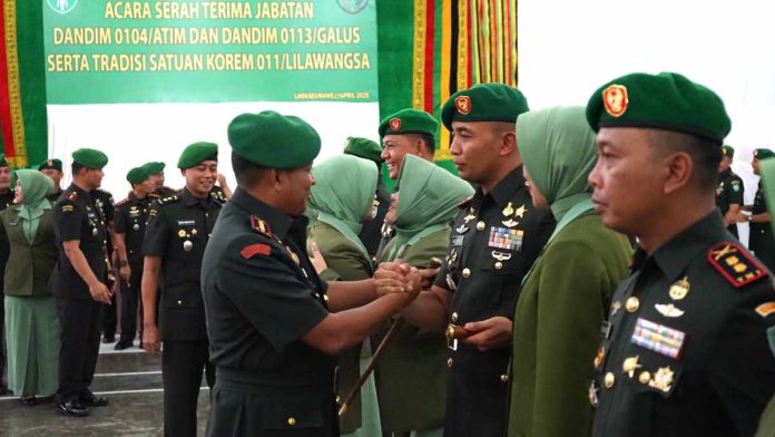 Komandan Korem (Danrem) TNI 011 Lilawangsa, Kolonel Ali Imran memimpin upacara Serah Terima Jabatan (sertijab) dua Komandan Kodim (Dandim) di jajaran Korem Lilawangsa. Acara berlangsung di Gedung KNPI, Lhokseumawe, Sabtu (12/4/2025).