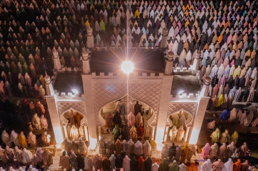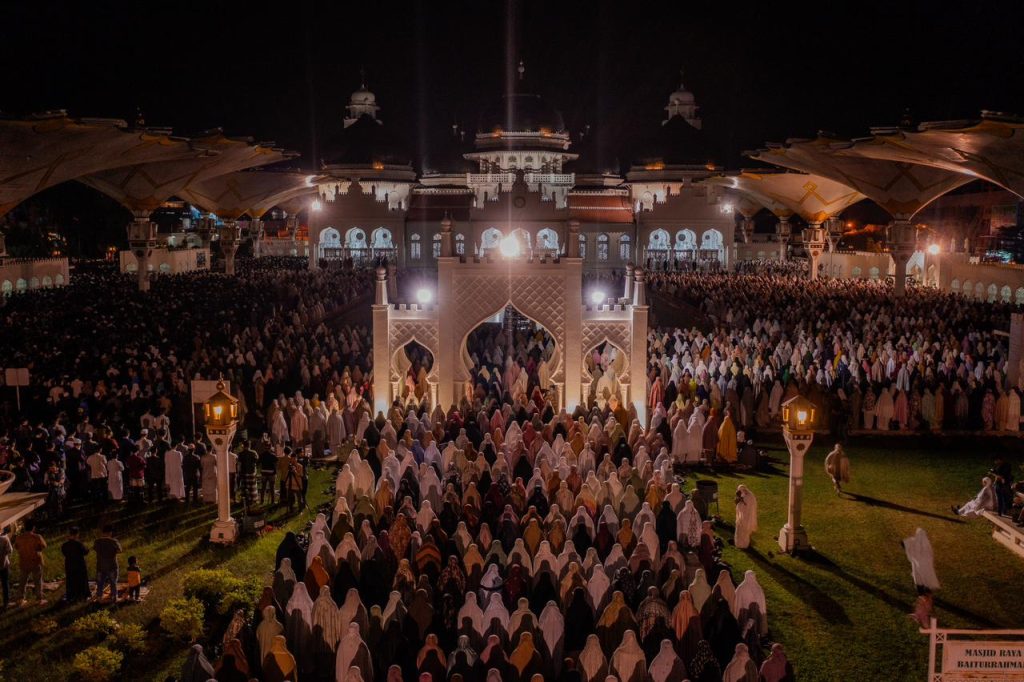 Ribuan jemaah salah Isya dan Tarawih memadati Masjid Raya Baiturrahman Banda Aceh di malam pertama Ramadan 1445 Hijriah, Senin malam (11/3/2024). Jemaah yang tidak tertampung di dalam masjid mengatur shaf di halaman.