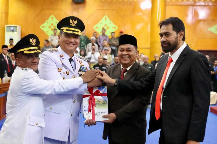 Gubernur Aceh Muzakir Manaf (Mualem) melantik Irjen (Purn) Armia Fahmi sebagai Bupati Aceh Tamiang di hadapan rapat paripurna DPRK Aceh Tamiang, Senin malam (17/2/2023).