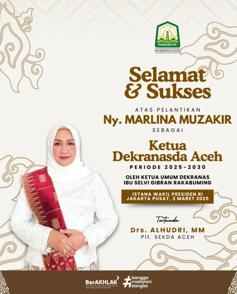 Ketua Umum Dekranas Selvi Ananda resmi melantik Marlina Usman, istri Gubernur Aceh Muzakir Manaf, sebagai Ketua Dewan Kerajinan Nasional Daerah (Dekranasda) Aceh periode 2025-2030.