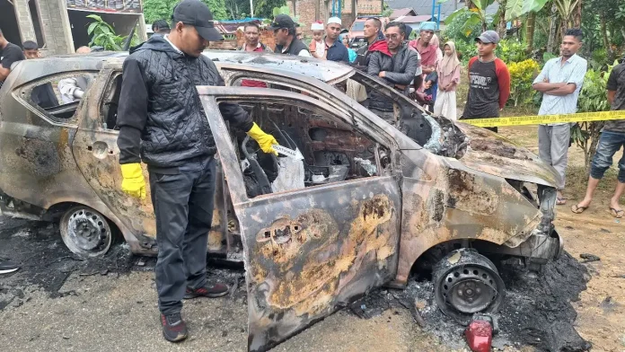 Mobil jenis Daihatsu Sigra BL 1612 DO itu terbakar saat parkir dekat rumahnya di Desa Seuneubok Buloh, Darul Aman.