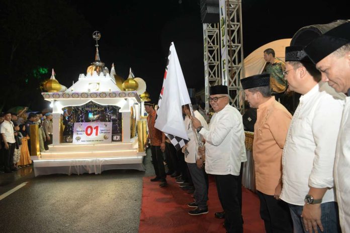 Penjabat (Pj) Gubernur Aceh Bustami Hamzah bersama Forkopimda Aceh melepas peserta Pawai Takbir Idulfitri 1445 Hijriah. Meski Kota Banda Aceh diguyur hujan sejak siang hari. Penglepasan peserta pawai di gerbang depan Masjid Raya Baiturrahman itu berlangsung meriah, kendati Banda Aceh diguyur hujan, Selasa (9/4/2024) malam.