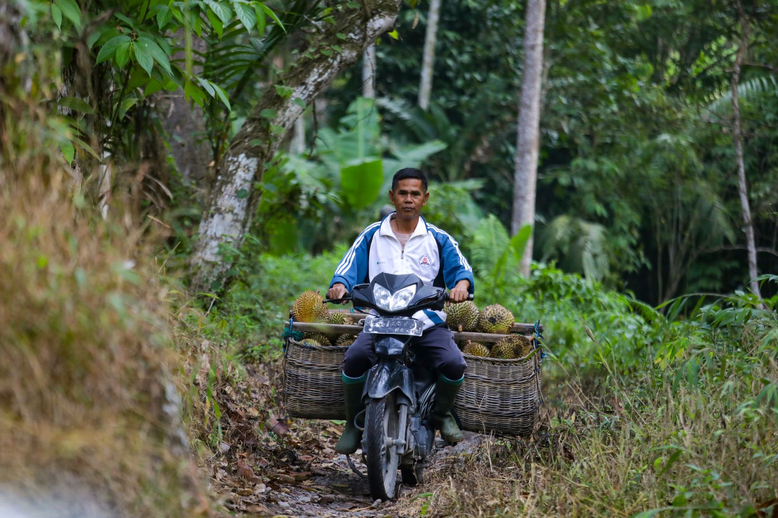 Membeli durian langsung di kebun, bikin pengepul harus melewati jalan setapak di hutan yang becek karena musim hujan serta cuaca yang tak menentu.