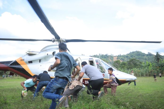 Bantuan logistik ke sejumlah daerah di Aceh Tengah terus dipasok menggunakan helikopter. Penyaluran lewat udara dilakukan karena akses ke lokasi sulit dijangkau jalur darat.