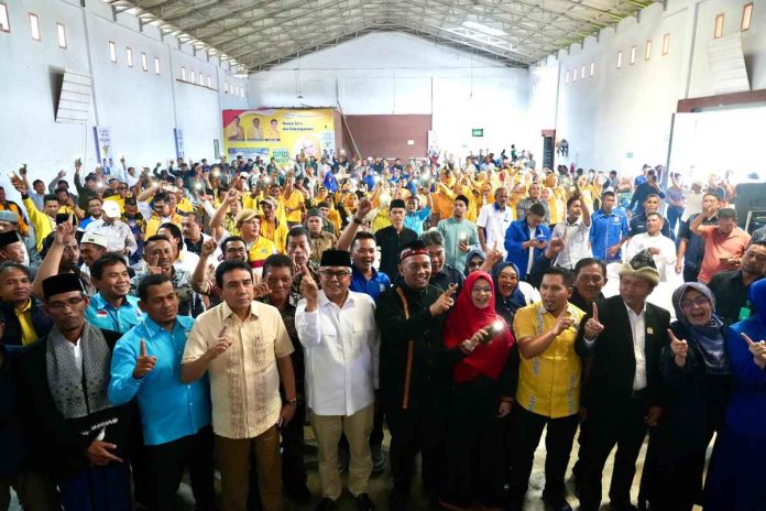 Seribuan kader lintas partai koalisi pengusung dan pendukung menghadiri silaturahmi dengan pasangan calon gubernur Aceh dan wakil gubernur Aceh nomor urut 1, Bustami Hamzah dan Fadhil Rahmi di Bener Meriah. Senin (14/10/2024).