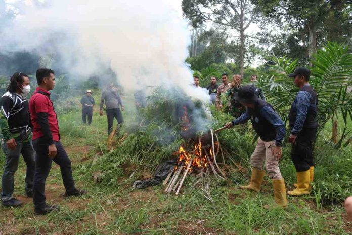 Di ladang ganja, tim yang dipimpin Pasi Intel Korem 011 Lilawangsa, Kapten Fredi Bastanta langsung mencabut seluruh tanaman ilegal tersebut, lalu dimusnahkan dengan cara dibakar. []